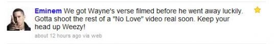 The Shady one confirmed via his Twitter page that we can expect a visual for his “No Love” collabo with Weezy off of his Recovery album to take place soon since the incarcerated rapper already shot his part. Recover officially hits stores June 22nd.